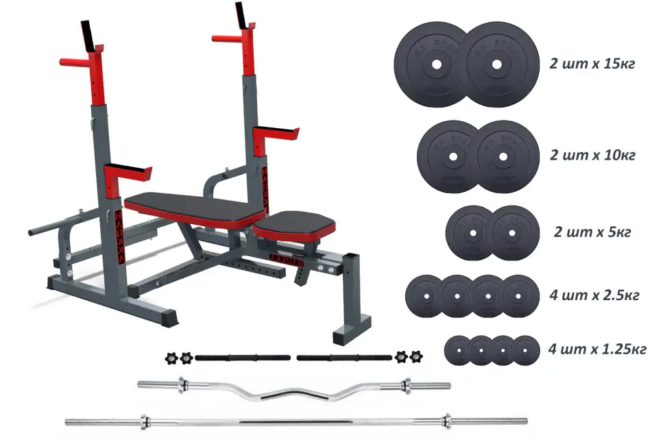 Скамейка 3090+ Стойки 50x50 со страховочными упорами, 4 грифа, 75 кг блинов RN-Sport